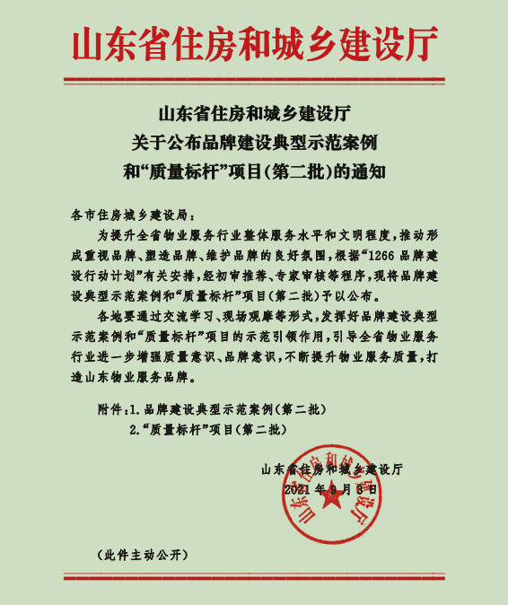 9月3日,山東省住房和城鄉建設廳公布關于品牌建設典型示范案例和“質量標桿”項目(第二批)名單,我公司作為品牌建設典型示范案例予以公布、服務管理的濰坊市文化藝術中心和峽山區創新創業服務中心同時獲得質量標桿項目。 ......